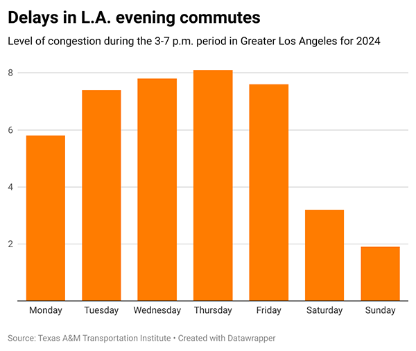 If you have the option of working from home on some days, choose Thursday. The Thursday evening commute is the worst of the week.
